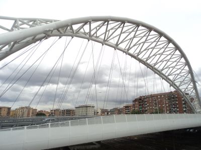 Die Settimia Spizzichino Brücke erstreckt sich über 240 Meter mit zwei weiß gestrichenen Bögen und Stahlkabeln, die die Viertel Garbatella und Ostiense verbinden.