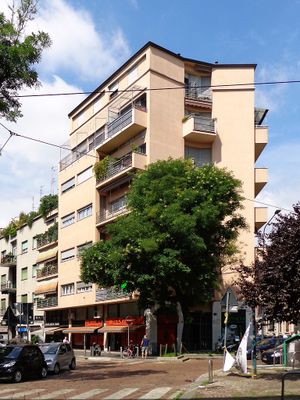 Das Haus zeigt, wie sich Mailands Architektur in den 1930er Jahren verändert hat, mit klaren Linien und praktischen Räumen, die den Alltag der Bewohner prägen. Man sieht diese moderne Gestaltung besonders an den großen Fenstern und der offenen Erdgeschosszone, die Läden und Leben miteinander verbinden.