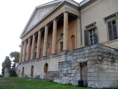 Villa Aldini ist ein neoklassizistisches Gebäude auf dem Osservanza-Hügel mit einer Fassade mit ionischen Säulen und verziertem Giebel. Das Bauwerk integriert Überreste einer Kirche aus dem 12. Jahrhundert, die als runde Empfangshalle im Inneren dient.