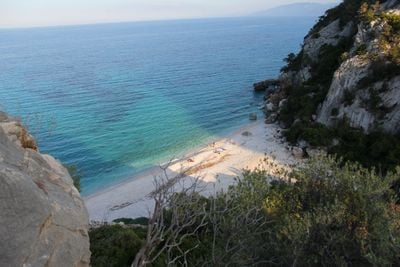 Cala Fuili ist eine Bucht mit feinem Kiesstrand an der Küste von Orosei, umgeben von steilen Kalksteinklippen, die zum Meer hinabfallen. Das Wasser ist klar und seicht, ideal zum Schwimmen, während die Felsen dicht an den Strand heranreichen.