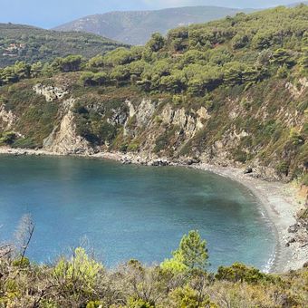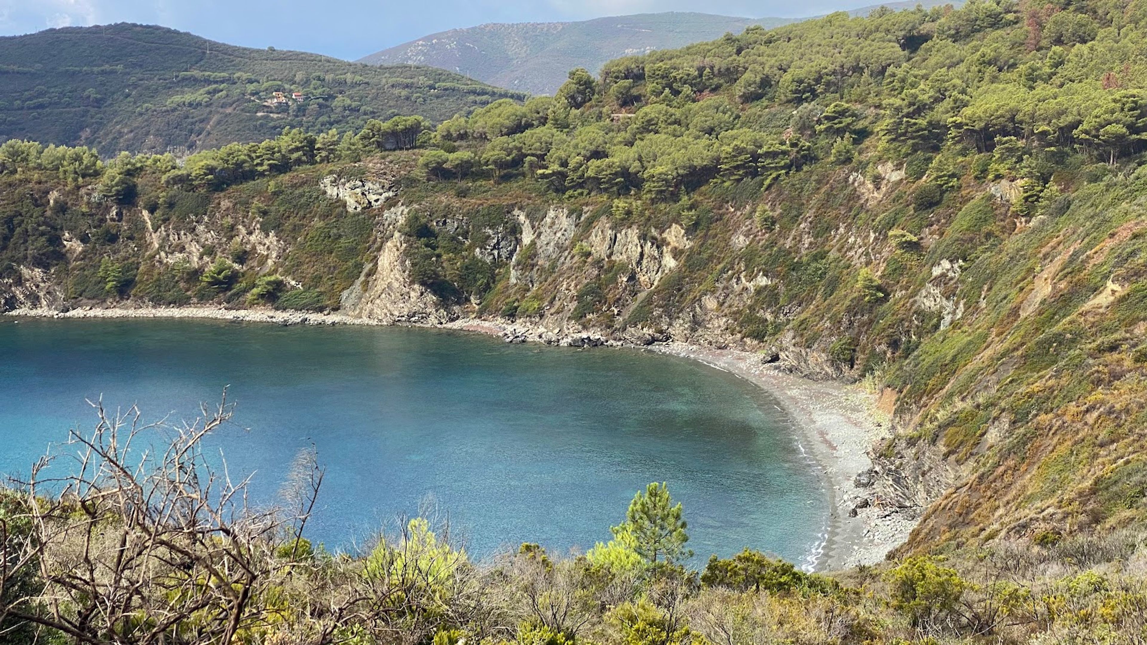 Ein abgelegener Streifen dunkler vulkanischer Kiesel erstreckt sich entlang der Südküste von Elba und bildet eine hufeisenförmige Bucht mit klarem Wasser.