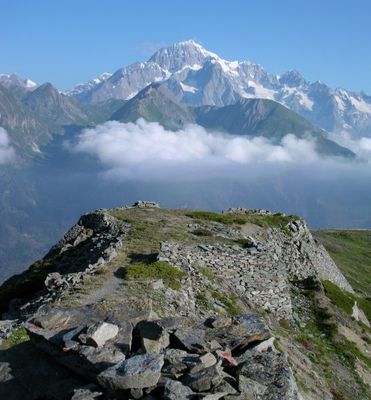 Die Steinmauern um die Anlage sind uber einen Meter dick und bieten direkte Blicke auf den Mont-Blanc-Massiv und die Siedlung La Thuile. Diese dicken Mauern zeigen die Bedeutung, die man einer langfristigen Verteidigung beigemessen hat.