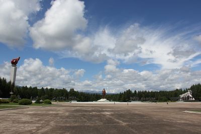 Das Großmonument Samjiyŏn erstreckt sich über 1.16 Kilometer und zeigt eine zentrale Bronzestatue von Kim Il-sung mit einem Fernglas.