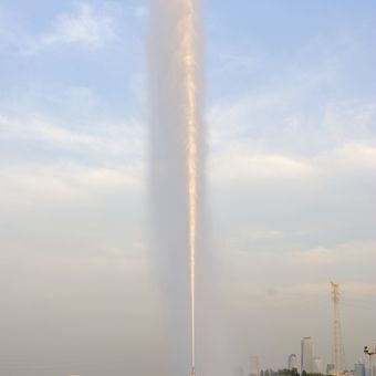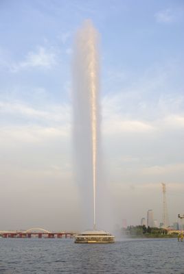 Der Weltpokal-Brunnen schießt Wasserstrahlen auf eine Höhe von 202 Metern und erzeugt damit eine bemerkenswerte Wasservorführung.