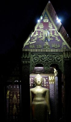 Wat Sen ist ein buddhistischer Tempel in Luang Prabang mit roten Mauern, die mit goldenen Mustern verziert sind, auf denen mythische Tiere und buddhistische Gottheiten dargestellt sind. Im Inneren steht eine große buddhistische Statue in glänzendem Gold.