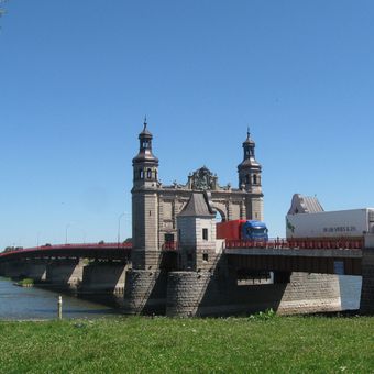 Die Königin-Luise-Brücke erstreckt sich 416 Meter über den Neman-Fluss mit sieben Granitpfeilern, die ihre Drei-Bogen-Struktur tragen.