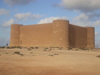 Die Architektur des Friedhofs integriert Festungselemente und schafft eine markante Gedenkstruktur in der libyschen Wüstenlandschaft.
