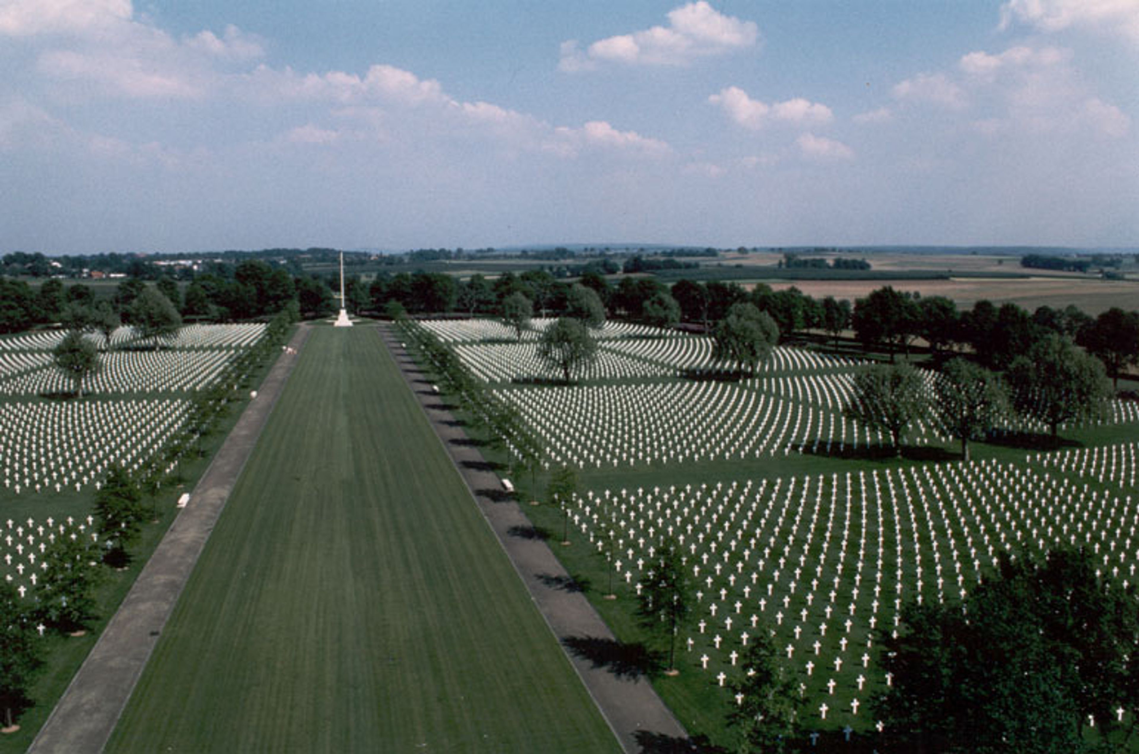 Der Amerikanische Friedhof der Niederlande erstreckt sich über 26.5 Hektar und verfügt über einen Gedenkturm, einen Spiegelbrunnen und 8,288 Militärgräber.