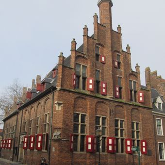 Die Struktur enthält architektonische Elemente des Nederrijns-gotischen Stils, erkennbar an den Stufengiebeln und regionalen mittelalterlichen Merkmalen.