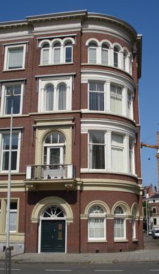 Pand, onderdeel van een reeks herenhuizen gebouwd in een gebogen rooilijn. Bakstenen lijstgevel. Balcon op consoles en met gietijzeren balustrade