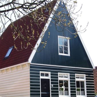 Houten huis met aangebouwde zijbeuk aan de rechterzijde en puntvormig voorschot