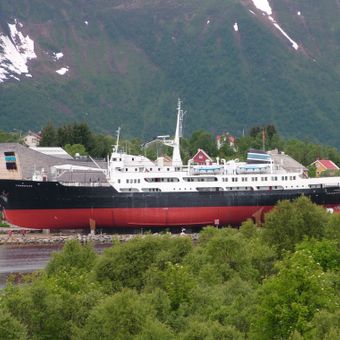 Das Hurtigruten Museum zeigt das MS Finnmarken Schiff von 1956 in Originalgröße, eingeschlossen in einer modernen Glasstruktur an der Küste.