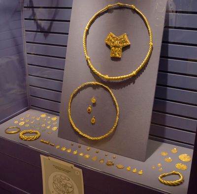 Der Hoen Gård Schatz enthält 207 Stücke, darunter 54 Gold- und vergoldete Silbergegenstände, Halsketten, Ringe und eine dreiblättrige Brosche aus der Karolingerzeit.