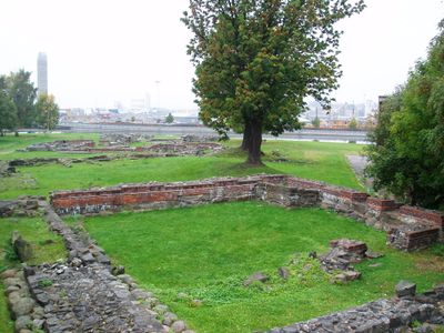 Die Überreste des Oslo Kongsgård Anwesens umfassen Befestigungsmauern, Türme und Fundamentstrukturen im öffentlichen Park Middelalderparken.