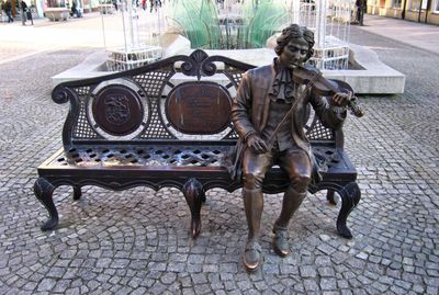 Die Bank dient als Treffpunkt für Musiker, Studenten und Anwohner, die sich zum Austausch über klassische Musik versammeln und kleine Aufführungen organisieren.