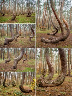 Jeder Kiefer in diesem Wald biegt sich genau in einem Winkel von 90 Grad auf einen Meter Höhe vom Boden weg und bildet ein einheitliches Muster, das niemand anders reproduzieren konnte, trotz vieler ähnlicher Pflanzversuche in Europa und Nordamerika.