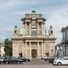 Die Kirche zeigt eine Steinfassade mit zwei Türmen, klassischen Pilastern und einer Kupferkuppel mit einer symbolischen Schlange als Bekrönung.