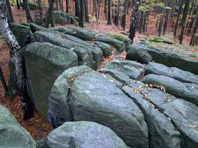 Bukowa Góra erhebt sich in den Świętokrzyskie-Bergen mit Quarzitformationen und dichter Waldfläche an seinen Hängen.
