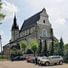 Das Kirchengebäude zeigt romanische und gotische Architekturelemente mit zwei erhaltenen Türmen und einer dreischiffigen Basilika-Struktur.