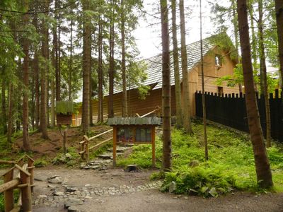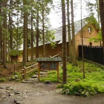 Das Holzkloster steht auf steinernen Fundamenten in der Tatra, mit rechteckigem Grundriss und einem Halbgiebeldach.
