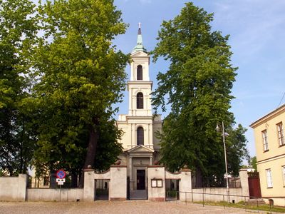 Die Kirche des Heiligen Adalbert ist ein katholisches Gotteshaus mit einer dreischiffigen Struktur und einem markanten hohen Turm an der Fassade. Das Gebäude bildet einen visuellen Ankerpunkt im Stadtbild und wird durch Nebengebäude wie ein Herrenhaus aus dem 19. Jahrhundert und eine historische Friedhofsstätte ergänzt.