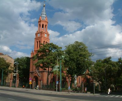 Die Kościół Matki Boskiej Bolesnej ist eine dreiSchiffige Kirche mit einem hohen Turm, dessen Spitze von einem Metallkreuz gekrönt wird. Die gesamte Struktur besteht aus roten Ziegeln, auch der umgebende Zaun folgt dieser Material- und Farbgebung.