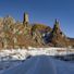Der Vovnushki-Komplex umfasst drei Steintürme auf gegenüberliegenden Felsen, mit vier Stockwerken, schmalen Fenstern und flachen pyramidenförmigen Dächern.