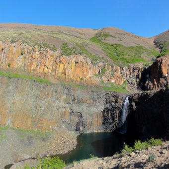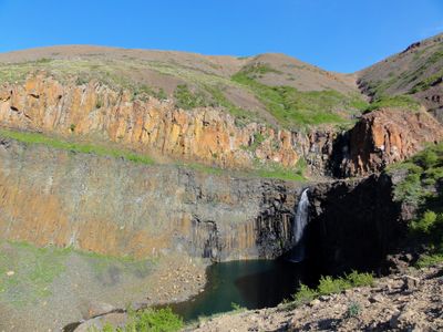 Die Schlucht behält auch während der Sommermonate erhebliche Eisformationen auf ihren Seen, wodurch eine außergewöhnliche arktische Landschaft in der Putorana-Plateau-Region entsteht.