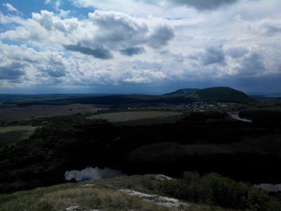 Der Kalksteinrücken von Kushtau erstreckt sich nahe der Stadt Sterlitamak bis zu den Koordinaten 53.69°N 56.09°E, mit Wegen zu zwei Gipfeln.