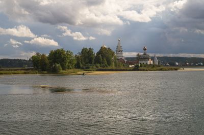 Das Ostrovoyezersky-Kloster ist ein orthodoxes Kloster in der Stadt Vorsma und liegt an den Ufern des Sees Vorozhba. Das Gelände umfasst mehrere Gebäude mit charakteristischen russischen Kirchendächern und Zwiebeldächern, die sich malerisch in der flachen Landschaft abheben.