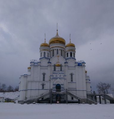 Die Kirche der Theotokos von Kasan ist ein weißes Gebäude mit traditioneller orthodoxer Architektur, das mehrere Kuppeln und Kreuze aufweist. Die Struktur zeigt klassische Merkmale des orthodoxen Kirchenbaus mit ihren charakteristischen aufragenden Elementen.