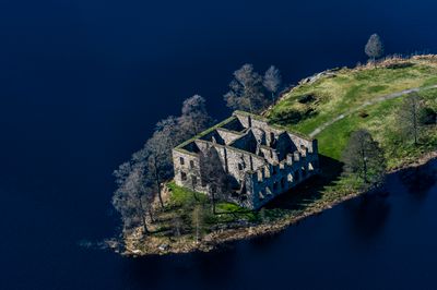 Eksjöhovgård erhebt sich als Steinruine auf einer Insel im See Eksjöhovgårdssjön, erreichbar über eine Holzbrücke, die die historischen Überreste mit dem Festland verbindet.