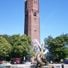 Der 58 Meter hohe Wasserturm aus roten Ziegeln verfügt über eine kupferverkleidete Spitze mit zwei unterschiedlich großen Kugeln.