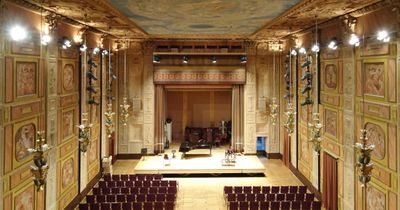 Die Wände und Decke des Grünewaldsalen zeigen dekorative Gemälde mit Figuren aus der Musikgeschichte und griechischen Mythologie, einschließlich des Gottes Apollo.