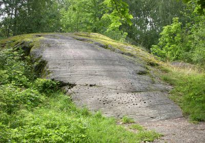 Nach der Entdeckung 1971 während der Straßenbauplanung änderten die Behörden die Streckenführung, um die größte Petroglyphen-Stätte der Provinz Stockholm zu erhalten.