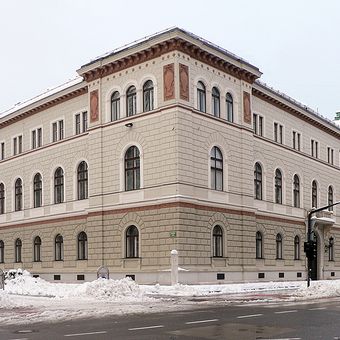 Der Palast präsentiert allegorische Statuen von Macht und Recht an der Prešeren-Straßenfassade, erschaffen vom Wiener Bildhauer Josef Beyer.