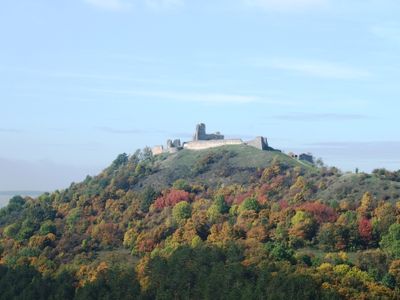 Die Mauern und Türme der Burg Branč stehen auf einem 473 Meter hohen Hügel mit Blick auf die Hügel von Myjavská pahorkatina und das Biele Karpaty Gebirge.