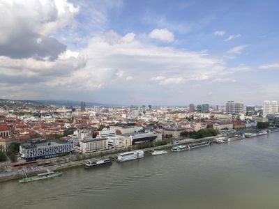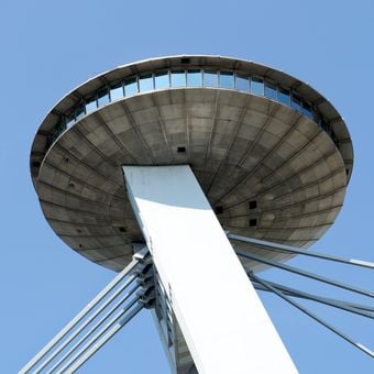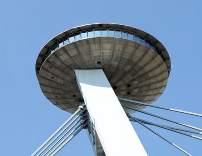 Das UFO Restaurant befindet sich 85 Meter über dem Boden auf einem Brückenpfeiler und bietet Ausblicke auf Bratislava und die Donau.