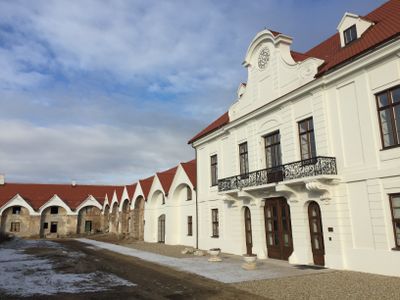 Das Gestüt Kopčany erstreckt sich über mehrere Gebäude mit Barockarchitektur und verfügt über Räume für Pferdezucht und Unterkunftsmöglichkeiten.