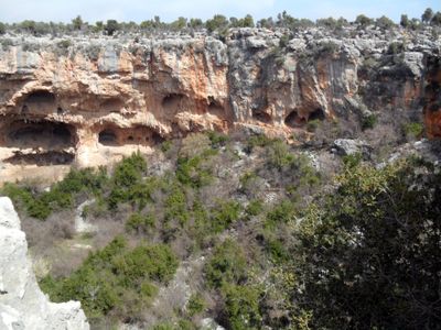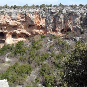 Mehrere künstliche Höhlen säumen die Wände des Erdlochs, während Felsgräber und Altäre auf frühere menschliche Aktivitäten hinweisen.