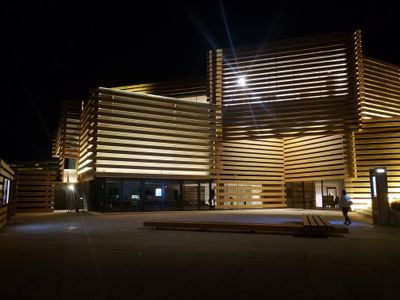 Das Museumsgebäude besteht aus gestapelten Holzkästen, die verschiedene Ausstellungsebenen bilden und durch ein lichtdurchflutetes Zentralatrium verbunden sind.