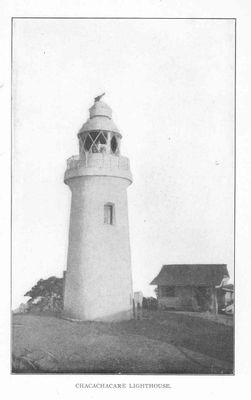 Der zylindrische weiße Leuchtturm erhebt sich 15 Meter an der Nordseite der Insel Chacachacare, mit einer roten Laterne und Balkon an der Spitze.