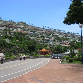 Chin Pao San ist ein Skulpturengarten und eine Grabstätte in Jinshans bergiger Landschaft mit modernen Kunstwerken, die über die Hänge verteilt sind. Die Anlage verbindet künstlerische Installationen mit Grabdenkmälern und bietet Aussichtspunkte zur Ostchinesischen See.