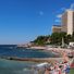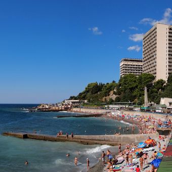 Koreiz ist eine Siedlung an der Schwarzmeerküste südwestlich von Yalta, die sich auf einer Höhe von etwa 120 Metern erstreckt. Im Hintergrund erheben sich Berge, während das Gelände geprägt ist durch zwei große Paläste mit unterschiedlichen architektonischen Merkmalen.