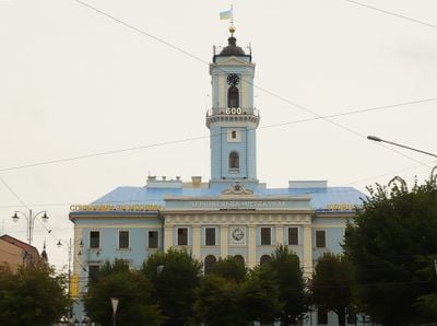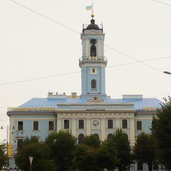 Das Rathaus zeigt eine spätklassizistische Architektur mit Renaissanceelementen und einer pastellblauen Fassade im Zentrum von Czernowitz.