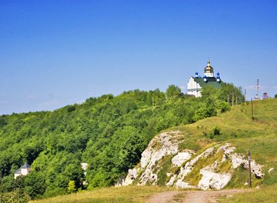 Der Klosterkomplex besteht aus weißen Steingebäuden mit traditionellen orthodoxen Architekturelementen und goldenen Kuppeln nahe der Region Tscherniwzi.