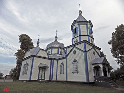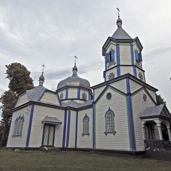 Das Holzgebäude steht bei den Koordinaten 51.150803, 28.878678 in der Region Korosten Raion des Oblast Schytomyr mit östlich-orthodoxer Architektur.