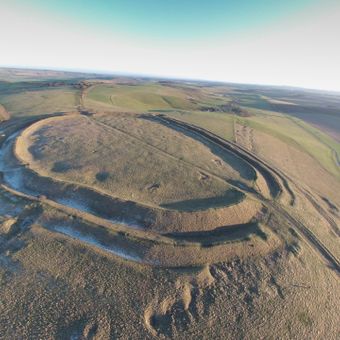 Barbury Castle ist eine prähistorische Befestigungsanlage auf Barbury Hill in Wiltshire, umgeben von zwei konzentrischen Gräben und Erdwällen. Die Anlage liegt auf einer Anhöhe mit weitem Blick über die umliegende Landschaft bis zu den fernen Hügeln im Westen.