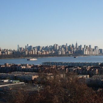 Die Gemeinde erstreckt sich entlang des Hudson River mit direktem Blick auf die Skyline von Manhattan und Wohngebieten nahe der Palisades-Klippen.