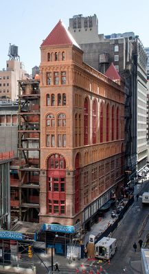 Das Corbin Building ist ein achtgeschossiges Bürogebäude in Manhattan, das Elemente der Romanischen Wiederbelebung aufweist. Seine Struktur besteht aus roten Ziegeln, verziert mit steinernen Bögen und detaillierten Terrakottaarbeiten, die die gesamte Fassade prägen.